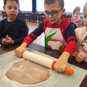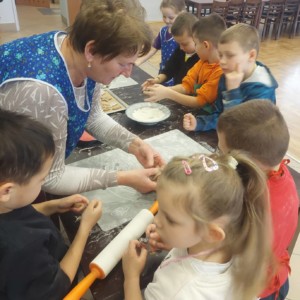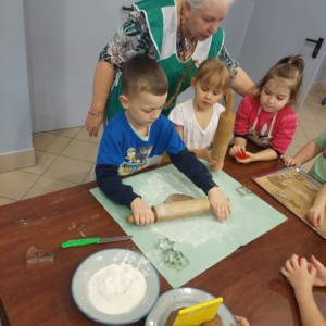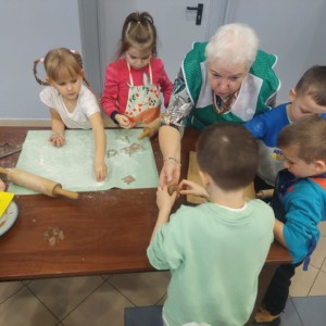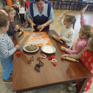 W powietrzu szybko rozszedł się cudowny aromat pierniczków – zapach, który jak magnes zachęcił dzieci do działania. Przedszkolaki z zainteresowaniem obserwowały przygotowywanie piernikowego ciasta, a chwilę później same zamieniły się w małych, pełnych zaangażowania cukierników. Z wielką starannością wałkowały ciasto, wykrawały kształty i tworzyły własne, niepowtarzalne świąteczne wypieki.