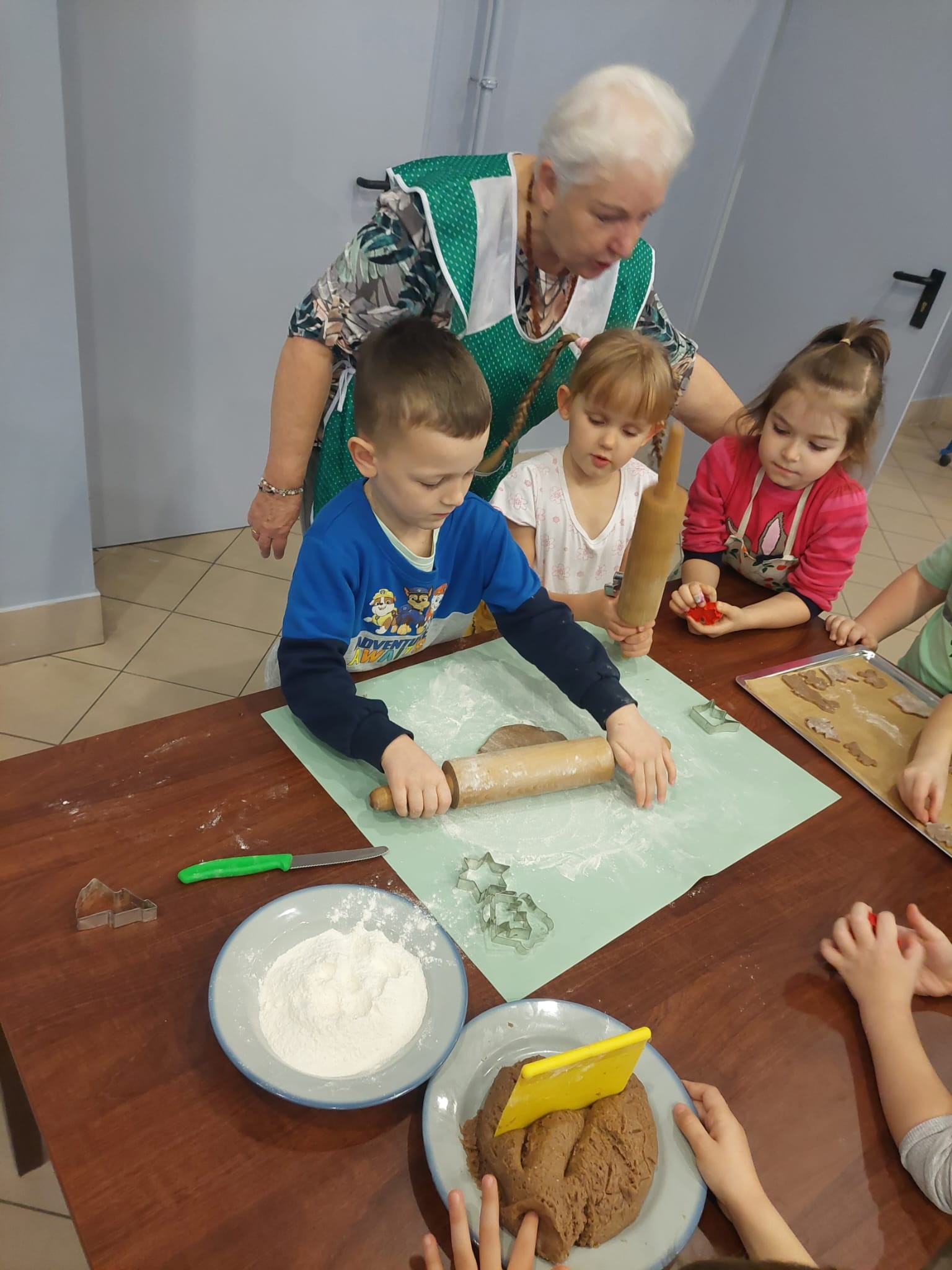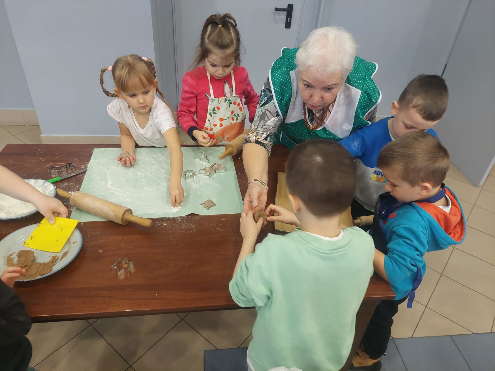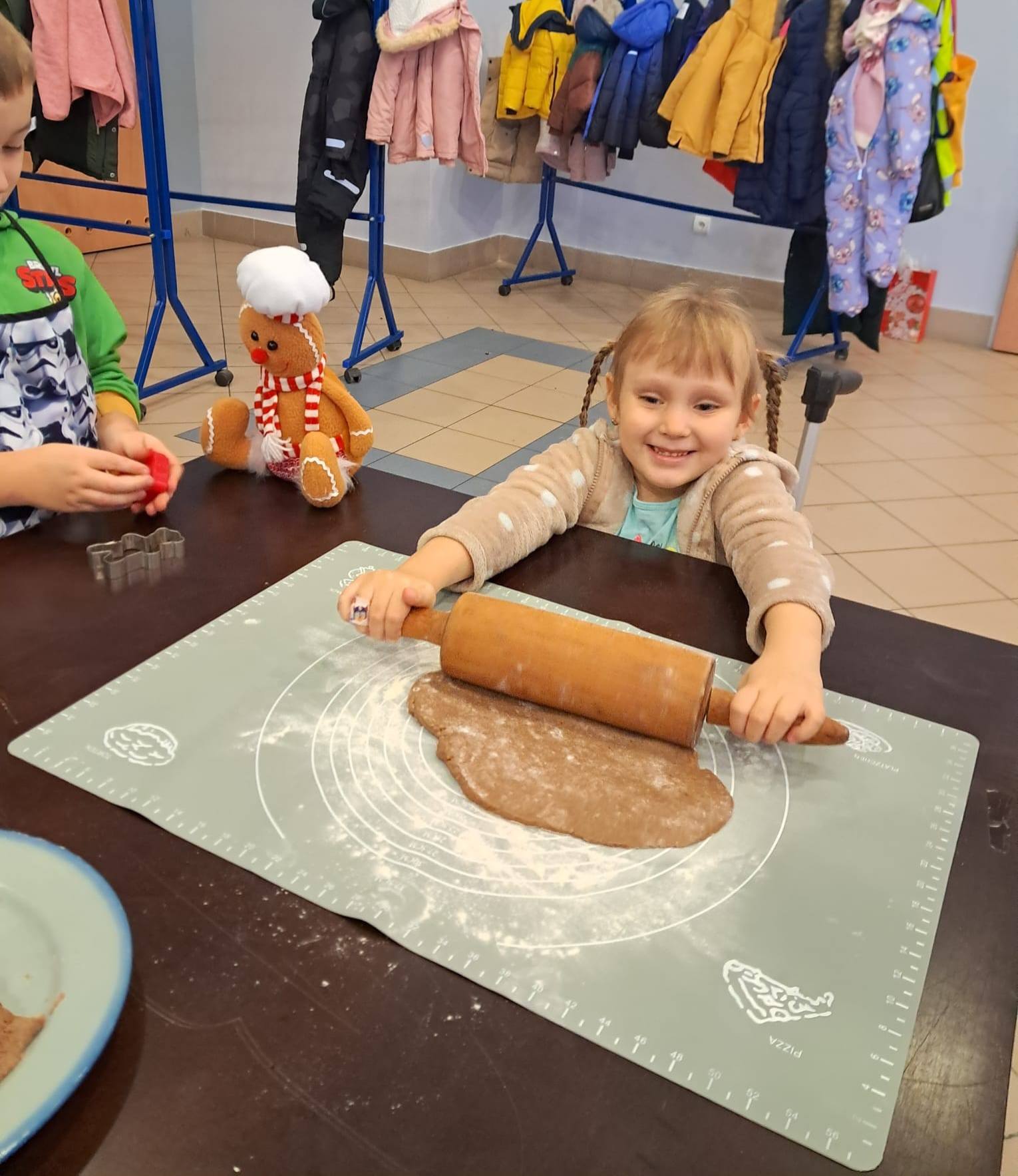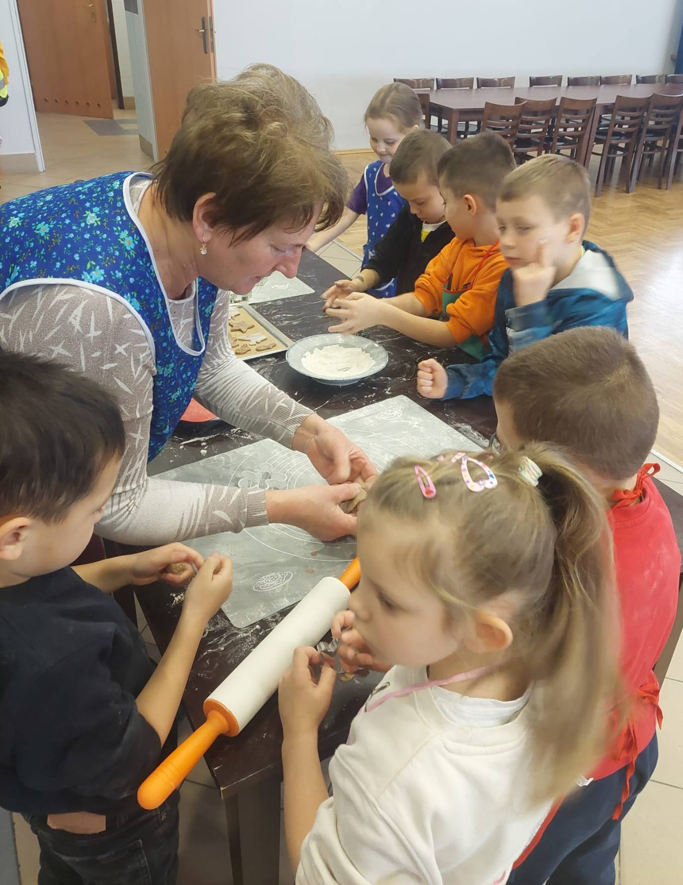 W powietrzu szybko rozszedł się cudowny aromat pierniczków – zapach, który jak magnes zachęcił dzieci do działania. Przedszkolaki z zainteresowaniem obserwowały przygotowywanie piernikowego ciasta, a chwilę później same zamieniły się w małych, pełnych zaangażowania cukierników. Z wielką starannością wałkowały ciasto, wykrawały kształty i tworzyły własne, niepowtarzalne świąteczne wypieki.