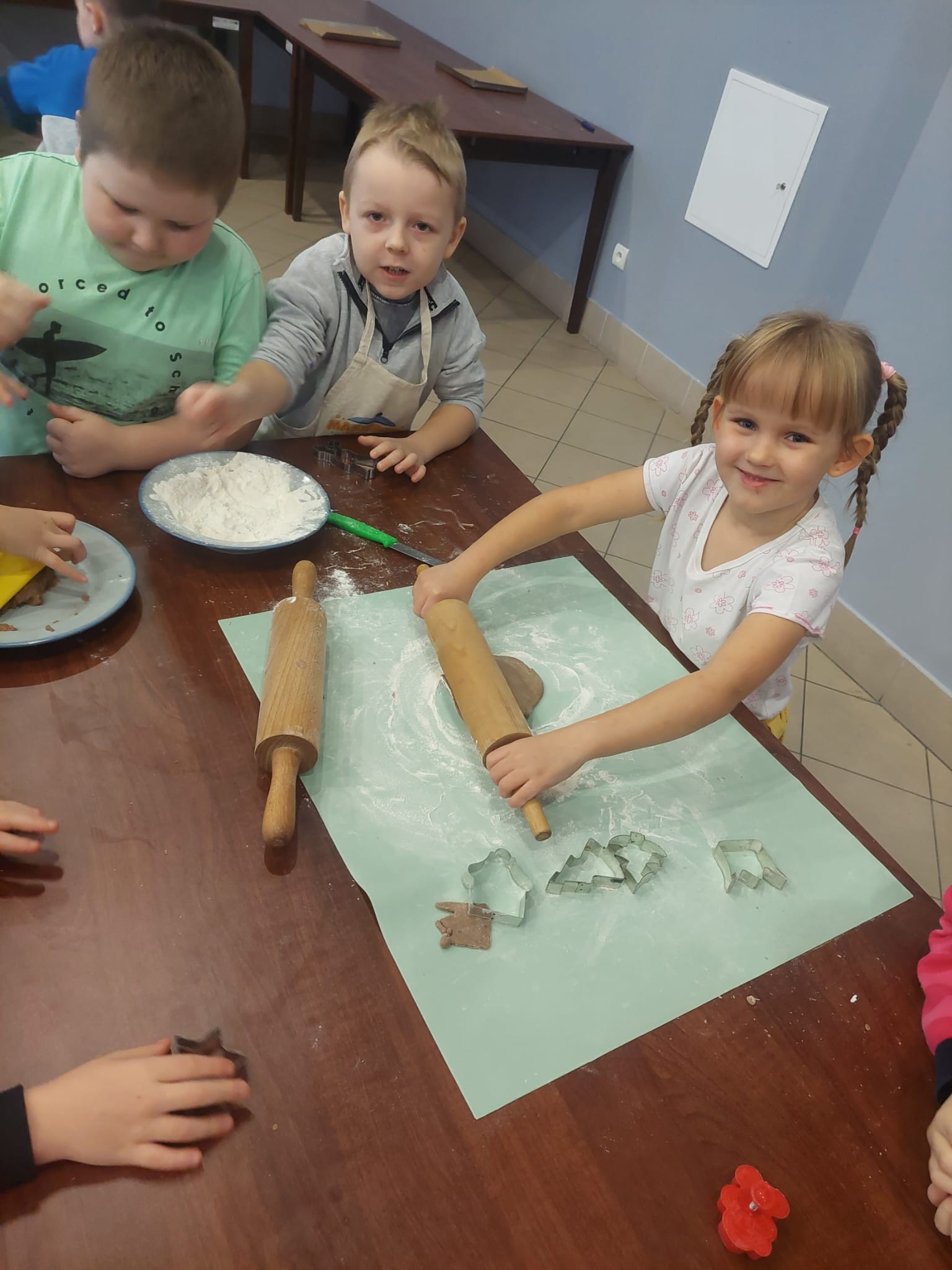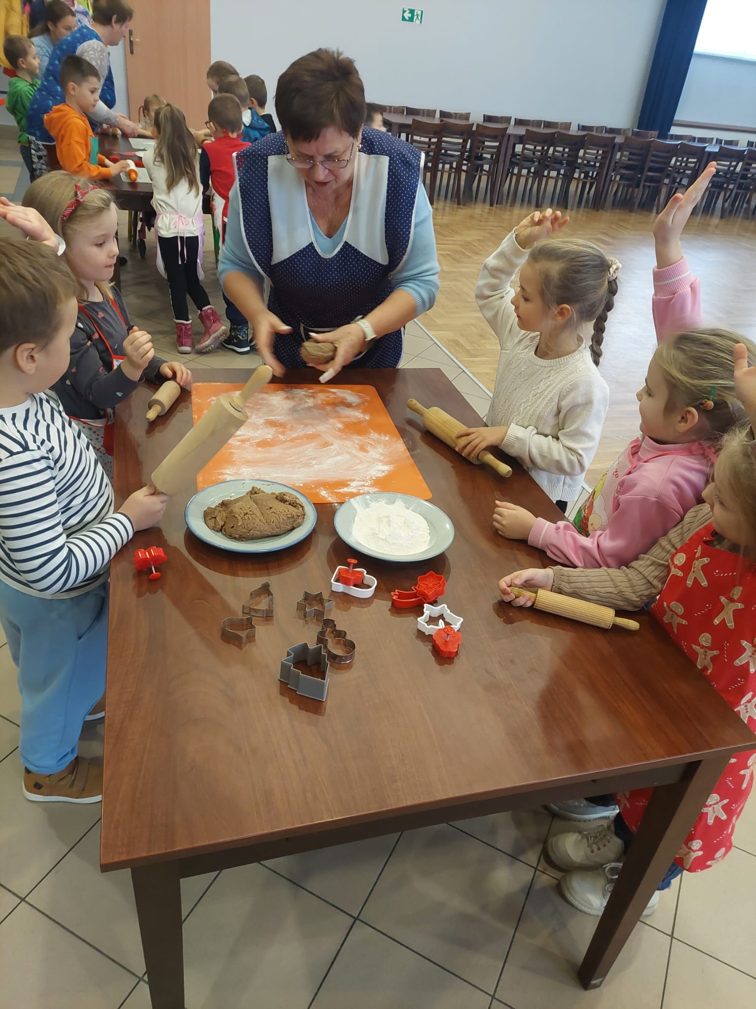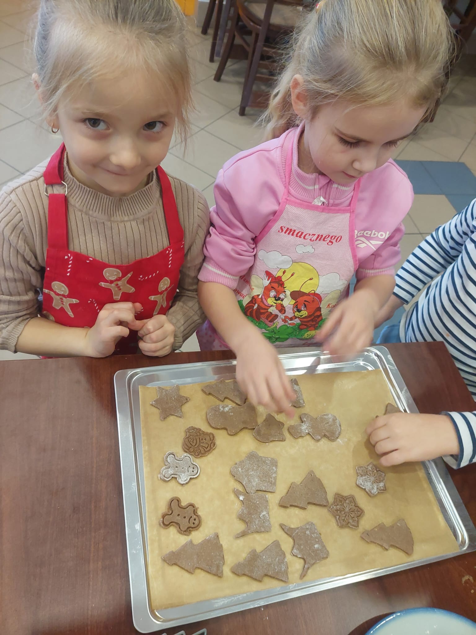 W powietrzu szybko rozszedł się cudowny aromat pierniczków – zapach, który jak magnes zachęcił dzieci do działania. Przedszkolaki z zainteresowaniem obserwowały przygotowywanie piernikowego ciasta, a chwilę później same zamieniły się w małych, pełnych zaangażowania cukierników. Z wielką starannością wałkowały ciasto, wykrawały kształty i tworzyły własne, niepowtarzalne świąteczne wypieki.