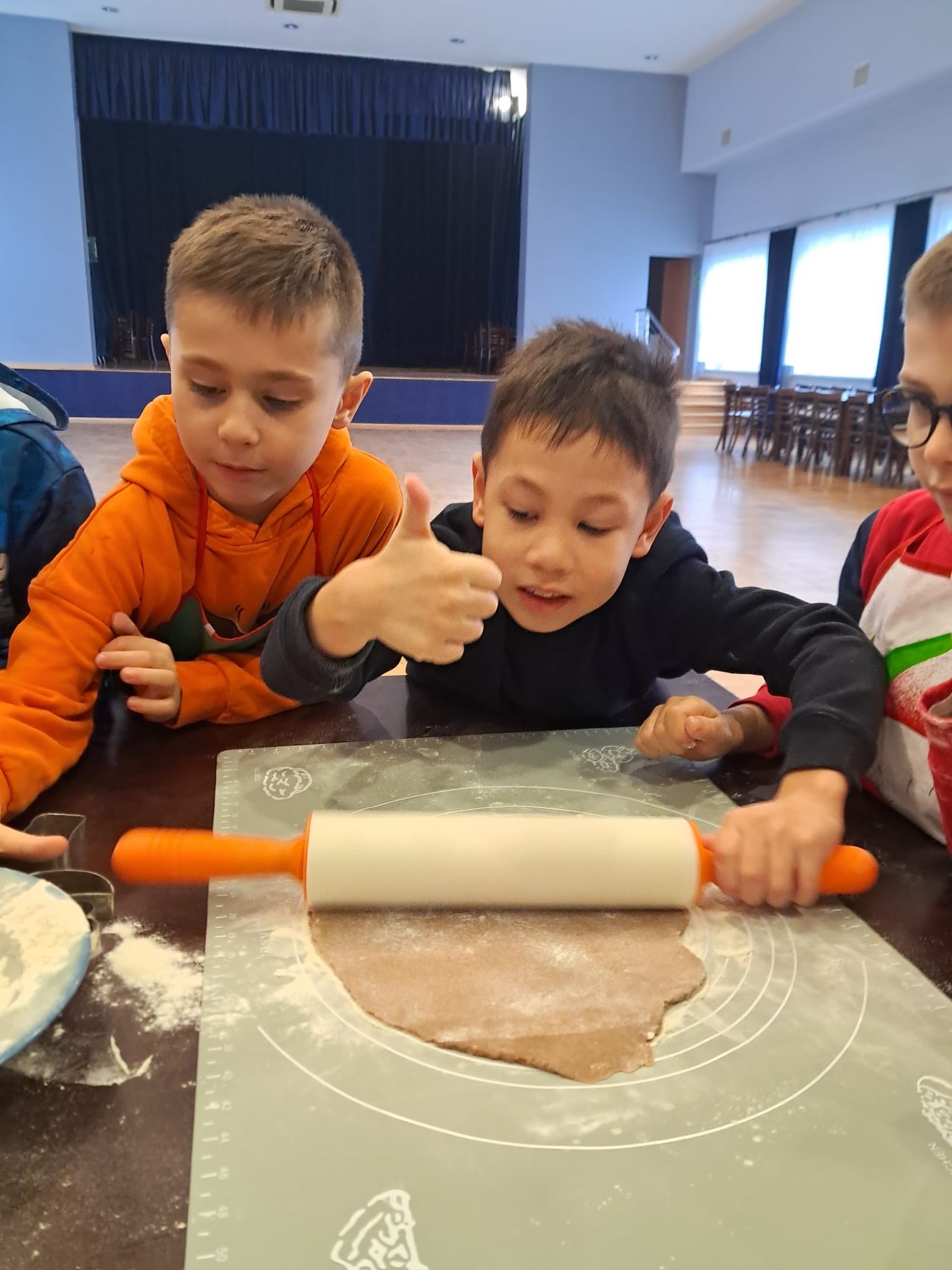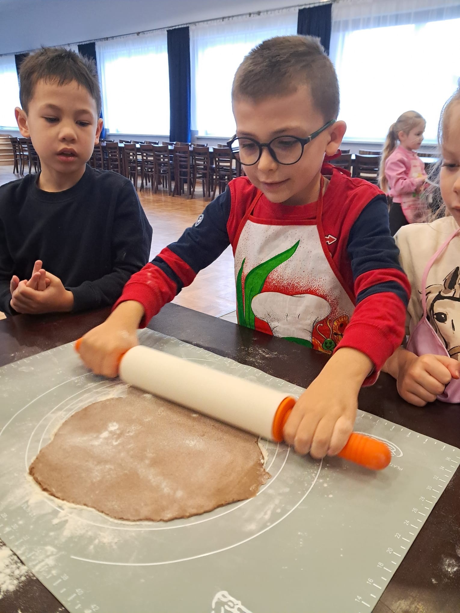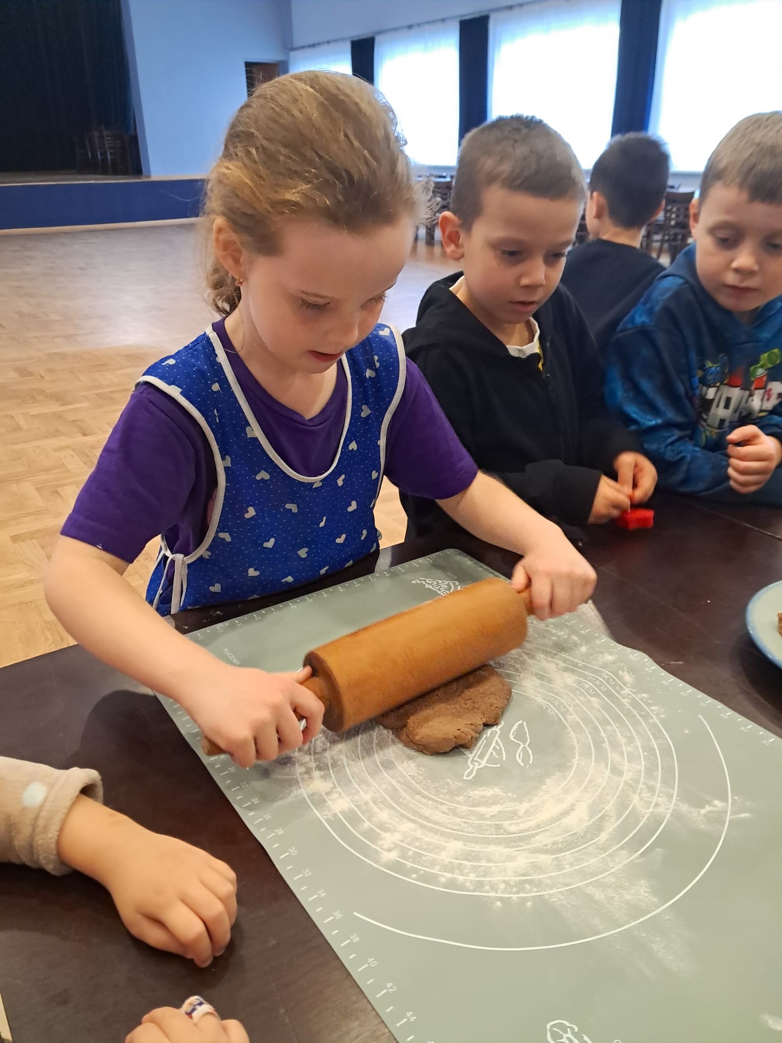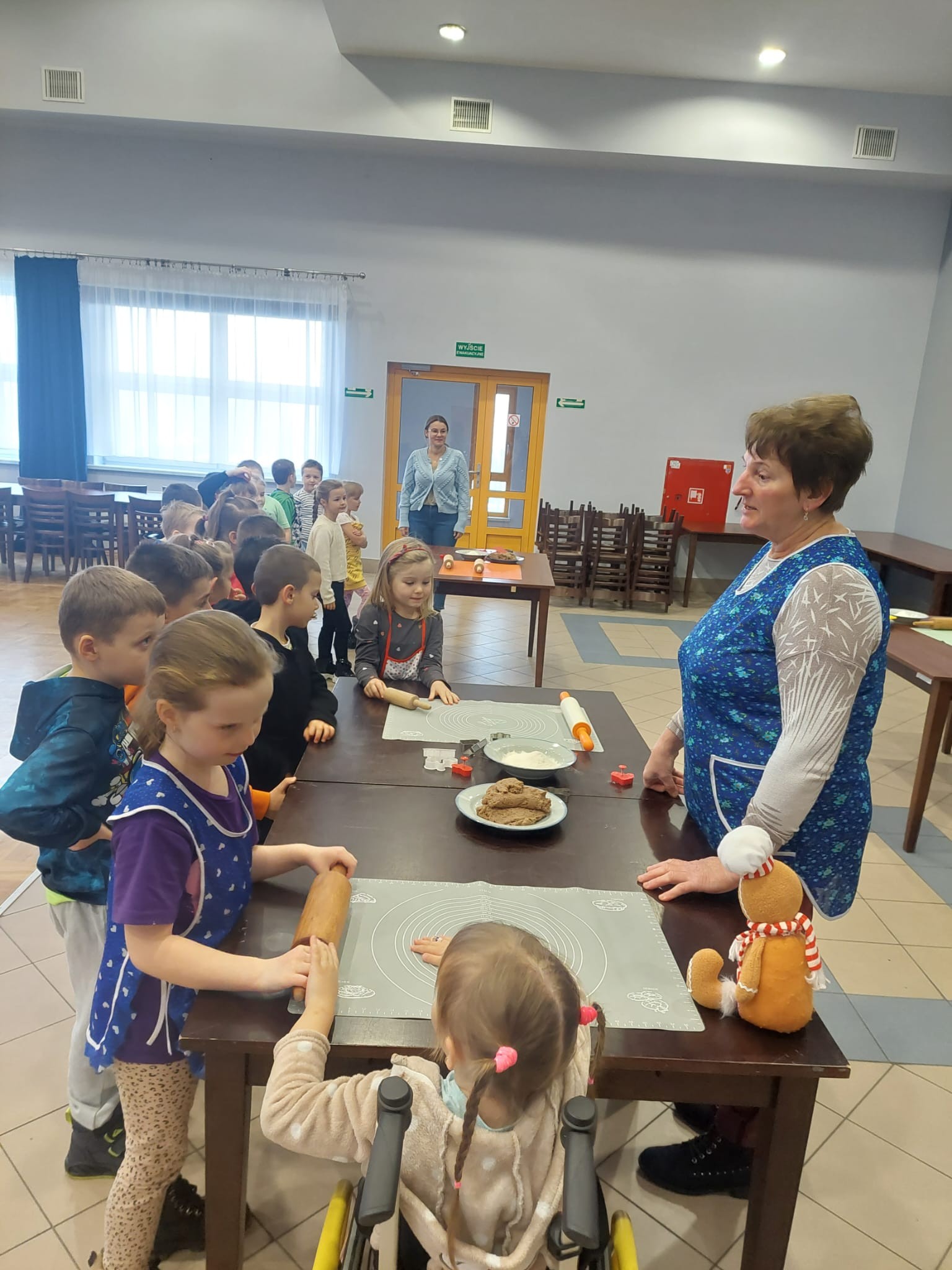 W powietrzu szybko rozszedł się cudowny aromat pierniczków – zapach, który jak magnes zachęcił dzieci do działania. Przedszkolaki z zainteresowaniem obserwowały przygotowywanie piernikowego ciasta, a chwilę później same zamieniły się w małych, pełnych zaangażowania cukierników. Z wielką starannością wałkowały ciasto, wykrawały kształty i tworzyły własne, niepowtarzalne świąteczne wypieki.