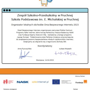 Za zaangażowanie w promowanie idei bezpiecznego internetu nasza szkoła otrzymała certyfikat organizatora lokalnych Dni Bezpiecznego Internetu 2023.