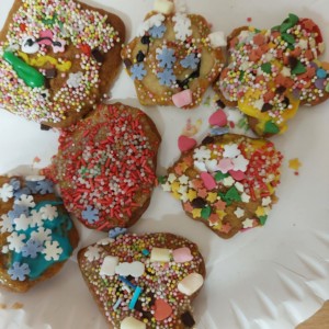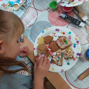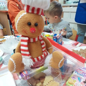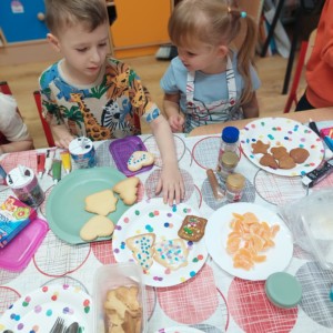 Podczas zajęć dzieci z ogromnym zaangażowaniem ozdabiały swoje wypieki lukrem, posypkami i innymi dekoracjami według własnych pomysłów. Powstały przepiękne, kolorowe pierniczki i ciasteczka, które nie tylko wyglądały wspaniale, ale także roztaczały w sali cudowny, świąteczny zapach.