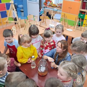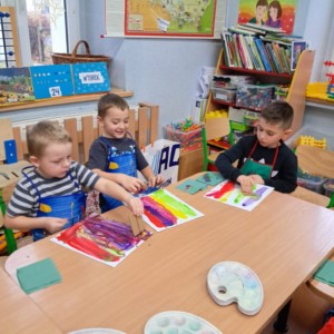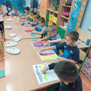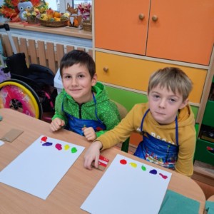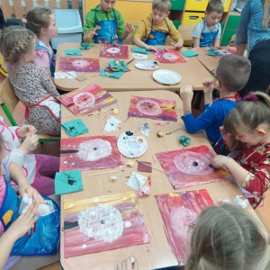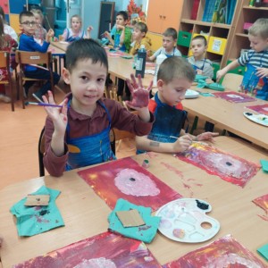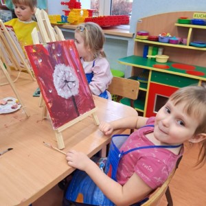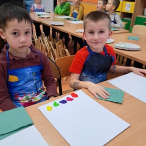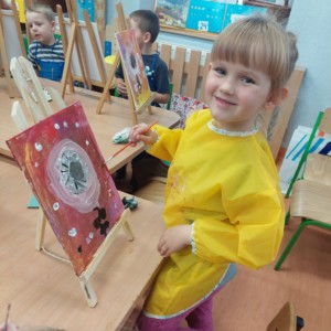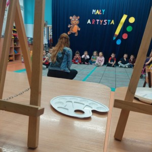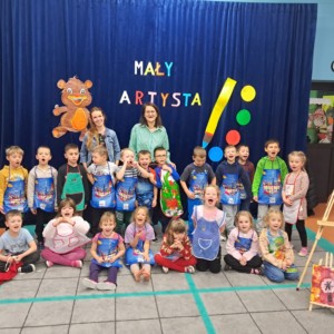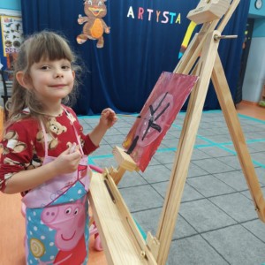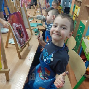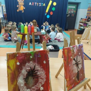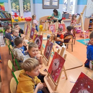 Podczas warsztatów przedszkolaki miały okazję poznać różnorodne techniki malarskie, obserwować sposób pracy artysty, a także samodzielnie eksperymentować z kolorami, fakturami i narzędziami malarskimi. Dzieci uczyły się, jak mieszać barwy i tworzyć własne, niepowtarzalne odcienie, poznawały podstawowe zasady kompozycji obrazu, a także rozwijały swoją wyobraźnię i ekspresję plastyczną. Zajęcia sprzyjały również kształtowaniu ważnych umiejętności – przedszkolaki ćwiczyły cierpliwość, koncentrację, a także współpracę w grupie, dzieląc się pomysłami i wzajemnie inspirując 🌈🖌