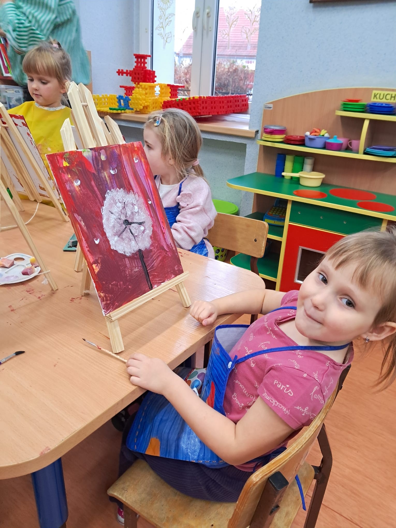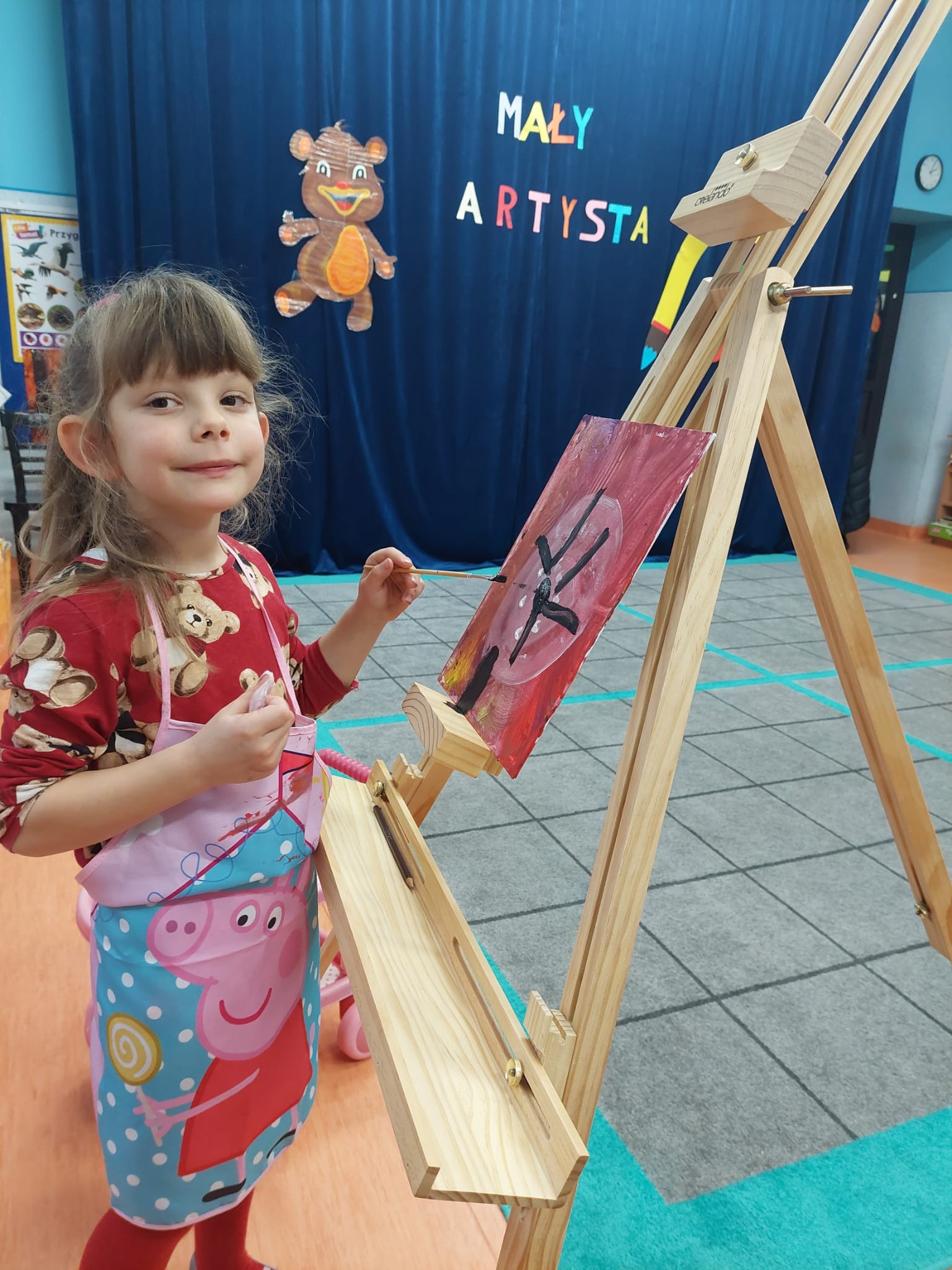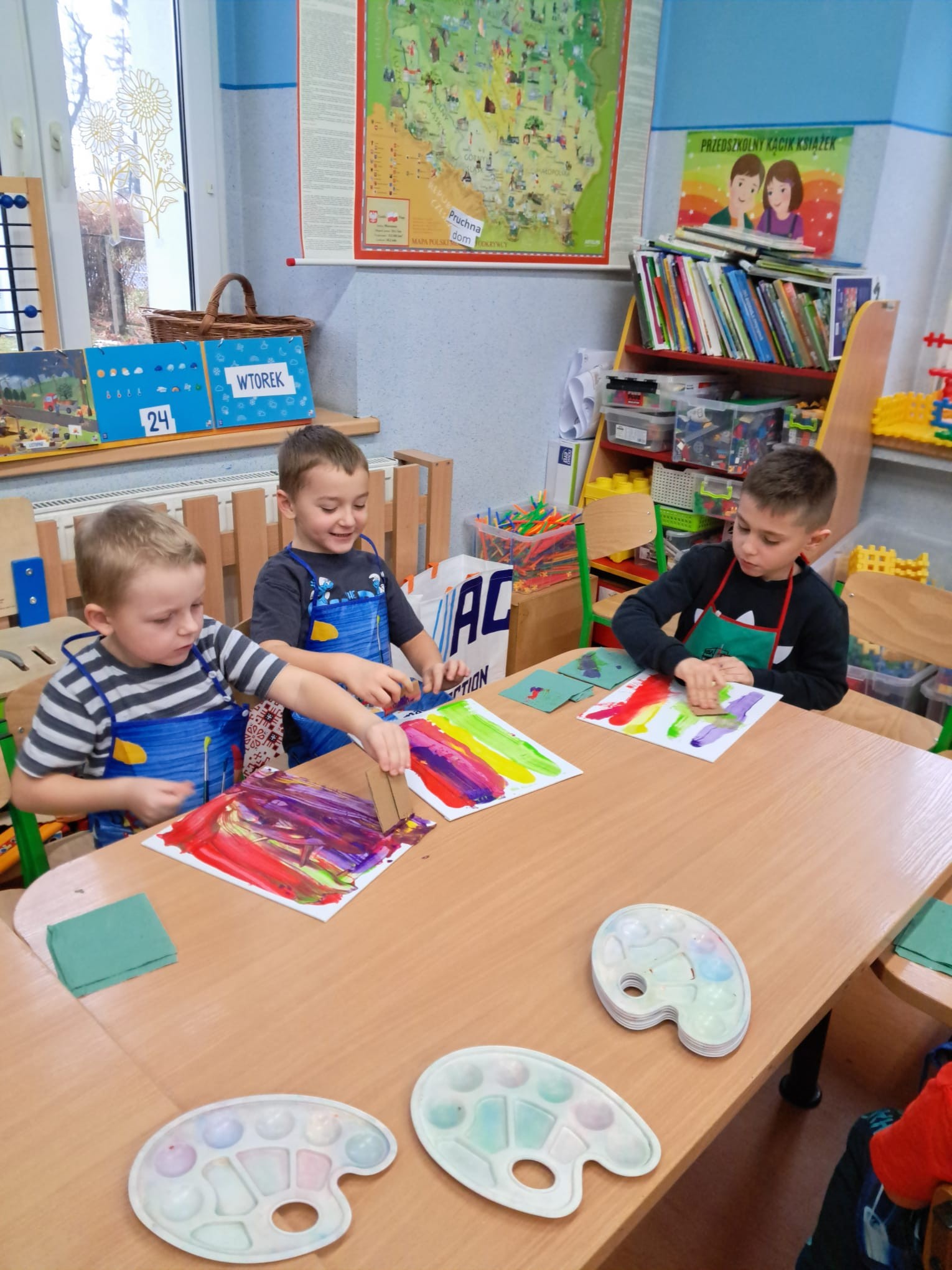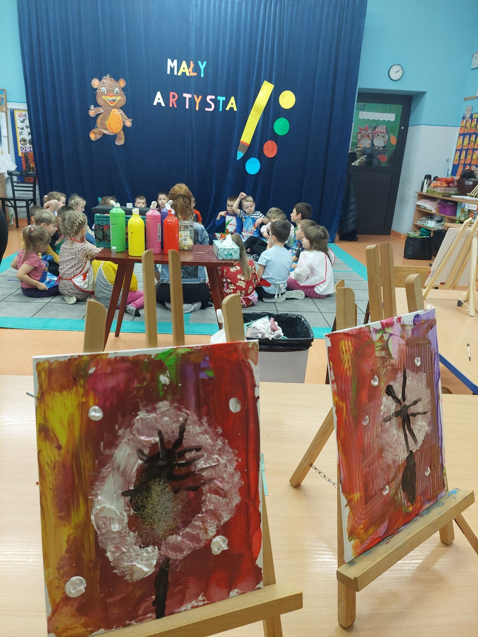 Podczas warsztatów przedszkolaki miały okazję poznać różnorodne techniki malarskie, obserwować sposób pracy artysty, a także samodzielnie eksperymentować z kolorami, fakturami i narzędziami malarskimi. Dzieci uczyły się, jak mieszać barwy i tworzyć własne, niepowtarzalne odcienie, poznawały podstawowe zasady kompozycji obrazu, a także rozwijały swoją wyobraźnię i ekspresję plastyczną. Zajęcia sprzyjały również kształtowaniu ważnych umiejętności – przedszkolaki ćwiczyły cierpliwość, koncentrację, a także współpracę w grupie, dzieląc się pomysłami i wzajemnie inspirując 🌈🖌