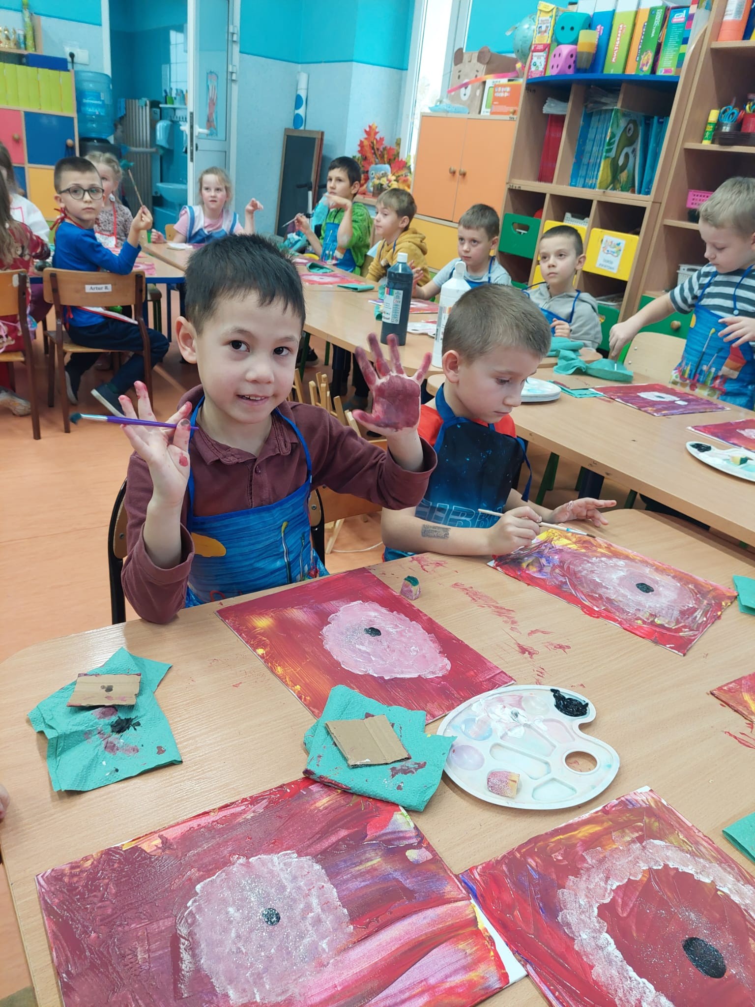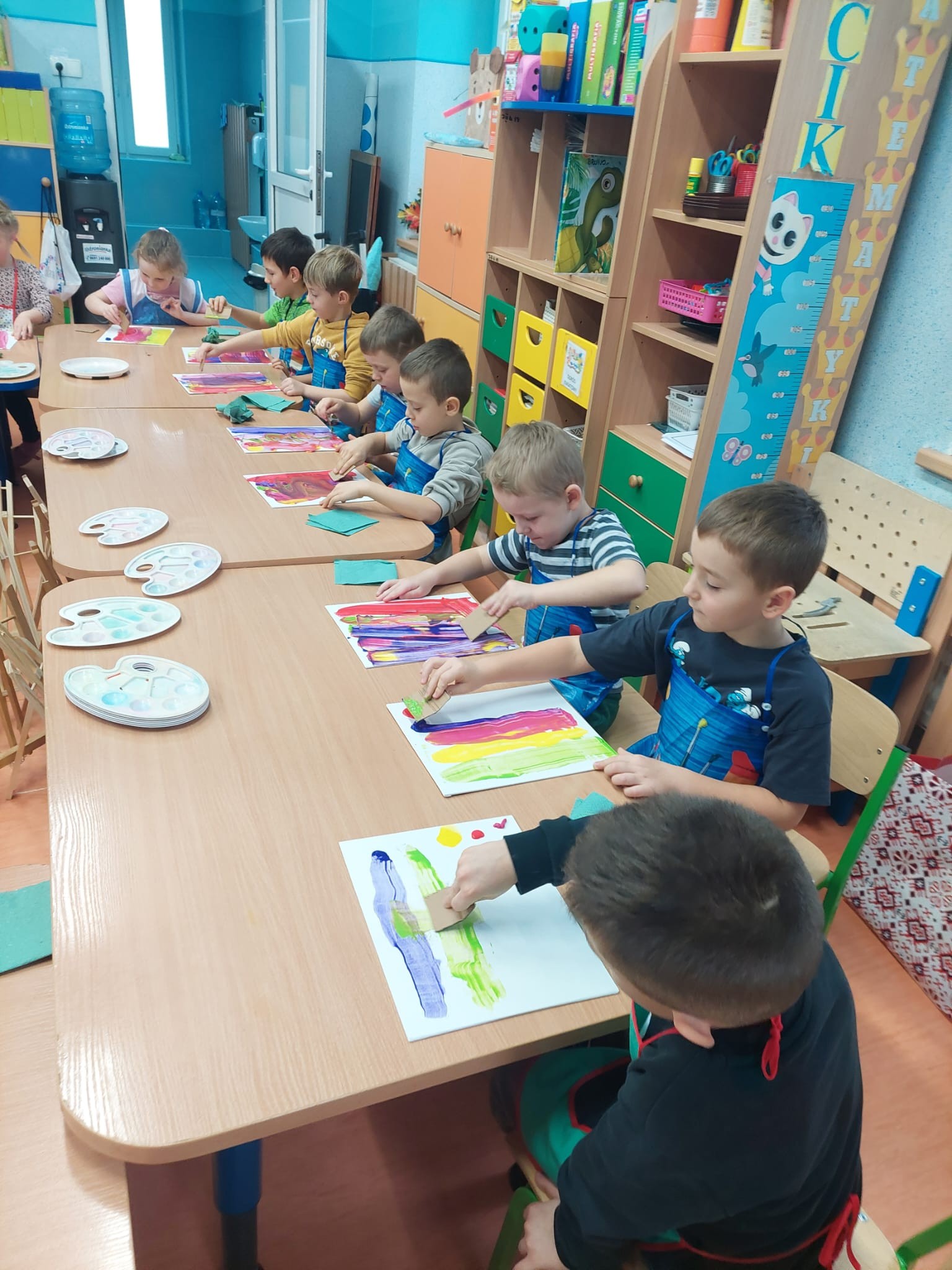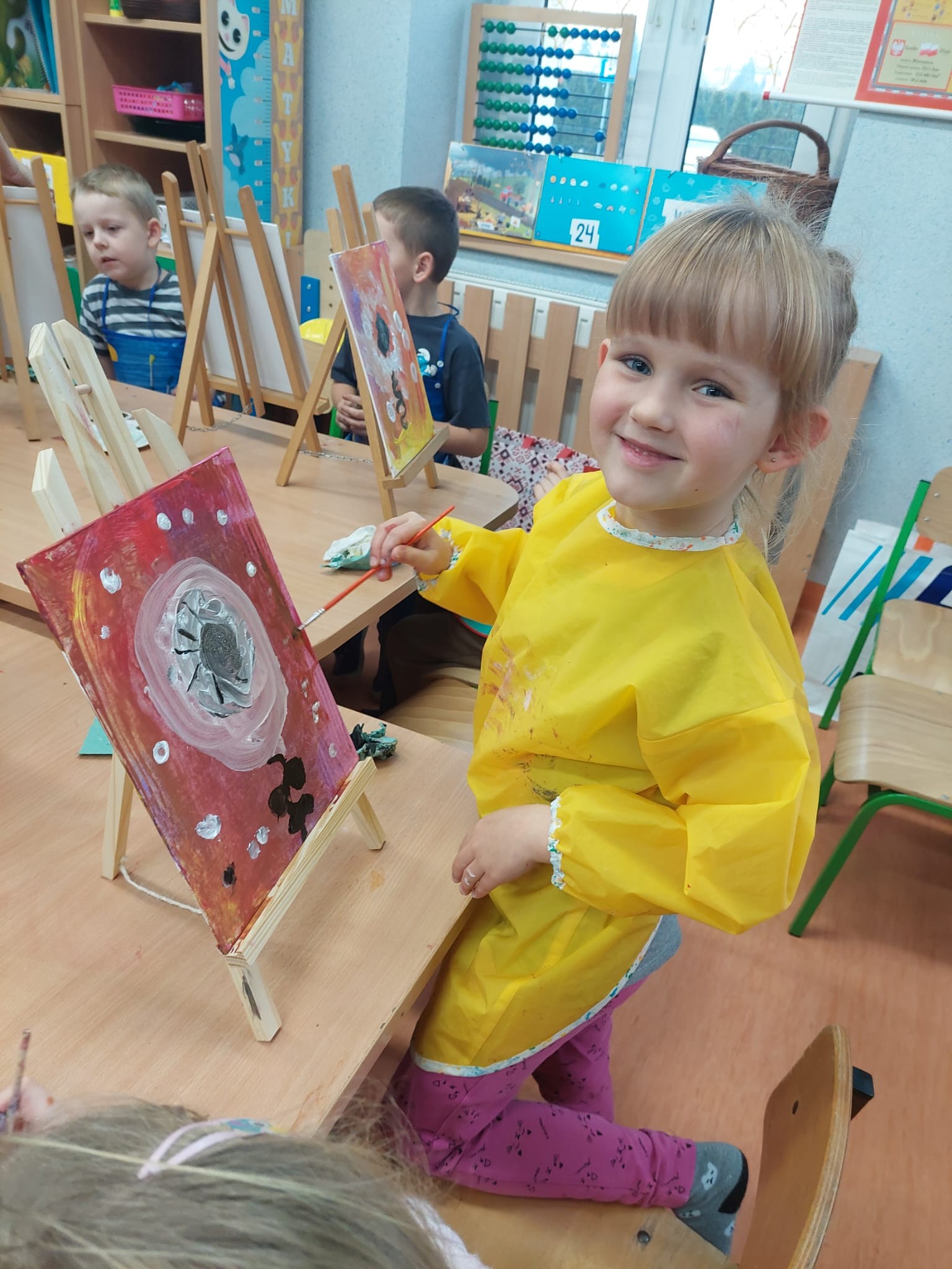 Podczas warsztatów przedszkolaki miały okazję poznać różnorodne techniki malarskie, obserwować sposób pracy artysty, a także samodzielnie eksperymentować z kolorami, fakturami i narzędziami malarskimi. Dzieci uczyły się, jak mieszać barwy i tworzyć własne, niepowtarzalne odcienie, poznawały podstawowe zasady kompozycji obrazu, a także rozwijały swoją wyobraźnię i ekspresję plastyczną. Zajęcia sprzyjały również kształtowaniu ważnych umiejętności – przedszkolaki ćwiczyły cierpliwość, koncentrację, a także współpracę w grupie, dzieląc się pomysłami i wzajemnie inspirując 🌈🖌