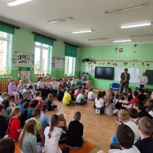 Z okazji obchodów Międzynarodowego Dnia Ziemi uczniów klas 1–3 odwiedził pan leśniczy – Dariusz Piechaczek. Podczas spotkania dzieci z ogromnym zainteresowaniem słuchały opowieści o lesie – o roślinach 🌳🌲 oraz zwierzętach 🐗🐻🐿️, które można spotkać w naturalnym środowisku. Pan leśniczy przybliżył również uczniom, na czym polega codzienna praca leśniczego oraz jak ważną rolę pełni on w ochronie przyrody.