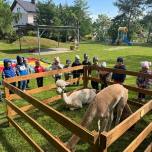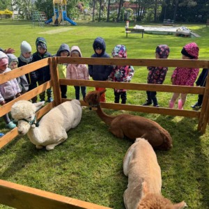 Nie zabrakło także części plastycznej – każdy przedszkolak stworzył własną alpakę, wyklejając ją miękkim futerkiem oraz kolorowymi pomponikami. Gotowe prace dzieci zabrały do domu na pamiątkę tego wyjątkowego dnia. Zajęcia odbywały się na świeżym powietrzu, w radosnej i przyjaznej atmosferze, co sprzyjało integracji, relaksowi i pogłębianiu więzi między dziećmi. To było niezapomniane spotkanie, które na długo zostanie w naszych sercach – zarówno tych małych, jak i dużych 🦙💛