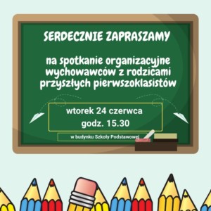 Serdecznie zapraszamy wszystkich rodziców dzieci rozpoczynających naukę w klasie pierwszej w roku szkolnym 2025/2026 na spotkanie organizacyjne z wychowawcami, które odbędzie się we wtorek (24 czerwca) o godzinie 15:30 w budynku szkoły podstawowej.