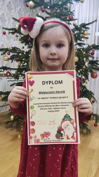 Z ogromną radością informujemy, że nasze przedszkolaki – Małgorzata Hernik oraz Karolinka Kozłowska – osiągnęły wspaniały sukces w prozdrowotnym konkursie plastycznym pt. „Święty Mikołaj też dba o zdrowie! Zdrowe ciało, radosne serce – edycja 2025”, organizowanym pod patronatem Burmistrza Strumienia. Małgorzata zajęła I miejsce, a Karolinka III miejsce, wyróżniając się nie tylko talentem plastycznym, ale także kreatywnym podejściem do tematu zdrowego stylu życia. 🖌️🎨