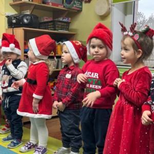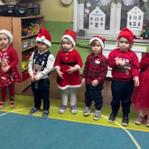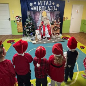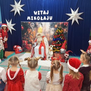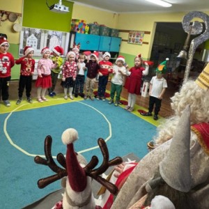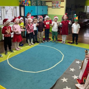 Przedszkolaki powitały Mikołaja wspaniałym programem artystycznym, który przygotowywały z wielkim zaangażowaniem. Były piosenki, wierszyki, życzenia oraz serdeczne uśmiechy — wszystko to sprawiło, że Mikołaj słuchał i oglądał występ z prawdziwym wzruszeniem.
