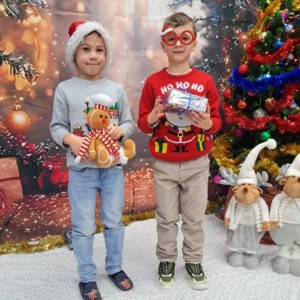 Po części artystycznej nadszedł moment najbardziej oczekiwany przez wszystkie dzieci — rozdanie prezentów. Każde dziecko otrzymało piękny upominek i kilka ciepłych słów zachęty do dalszego, wzorowego zachowania. Radości i emocjom nie było końca!