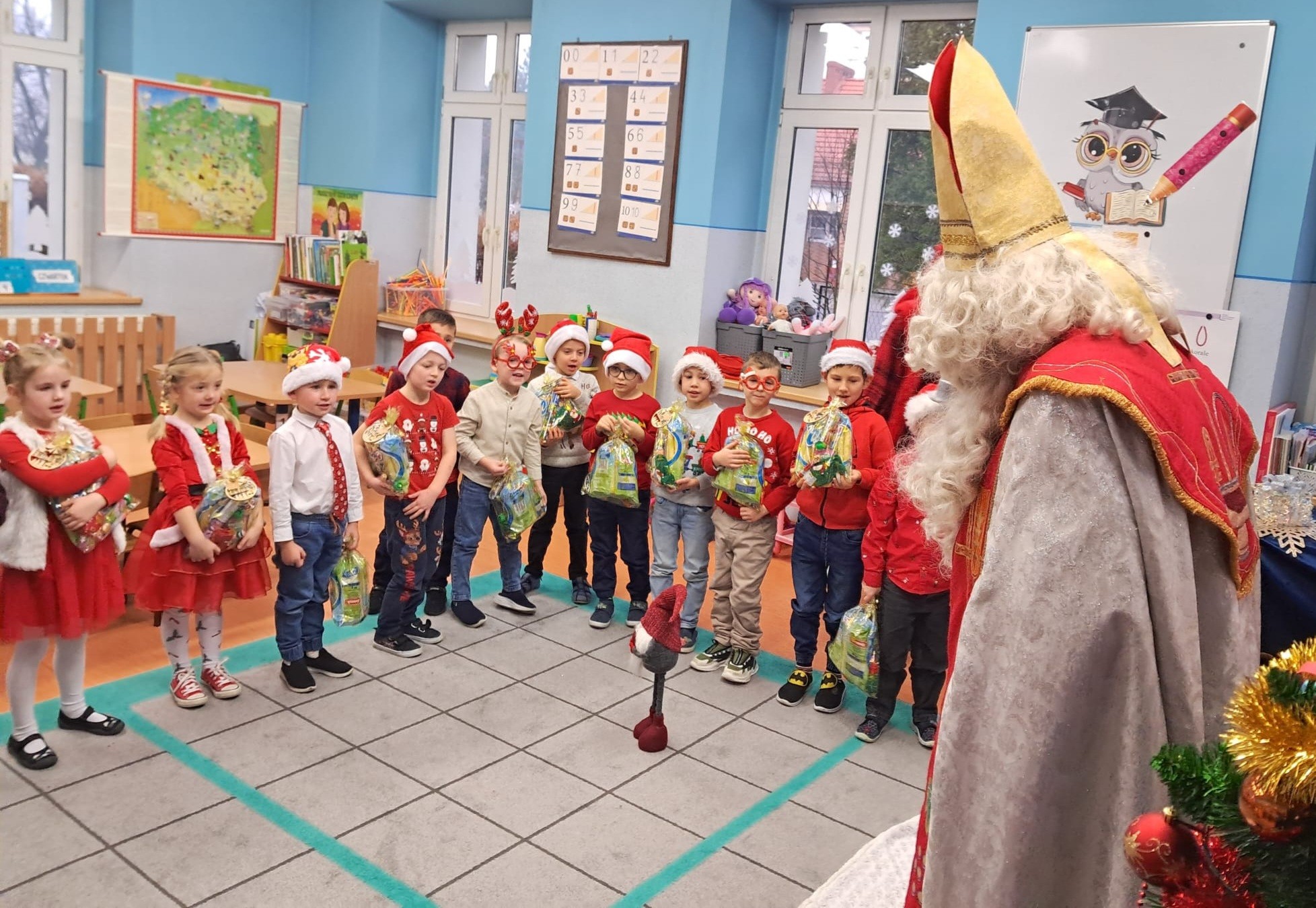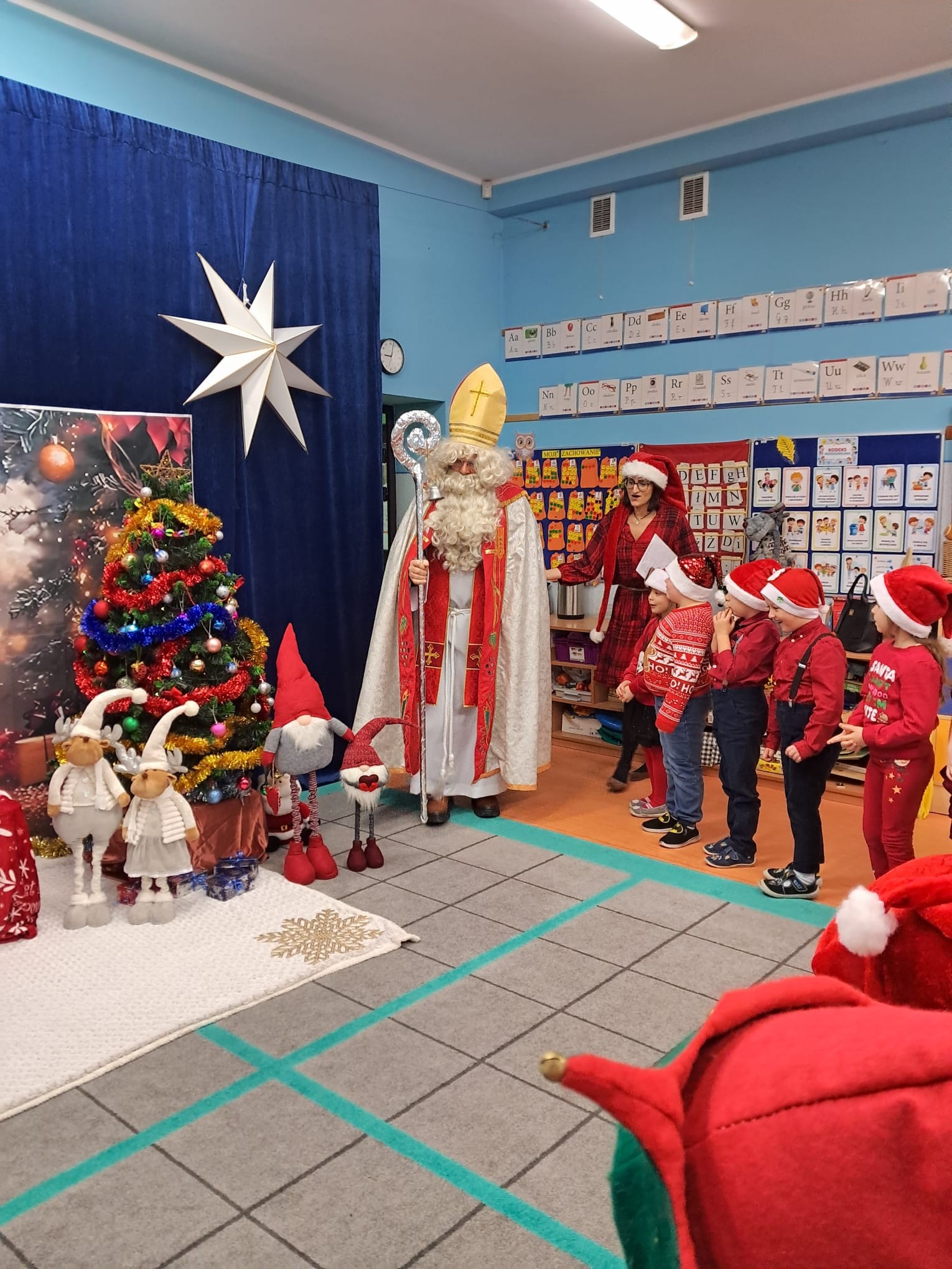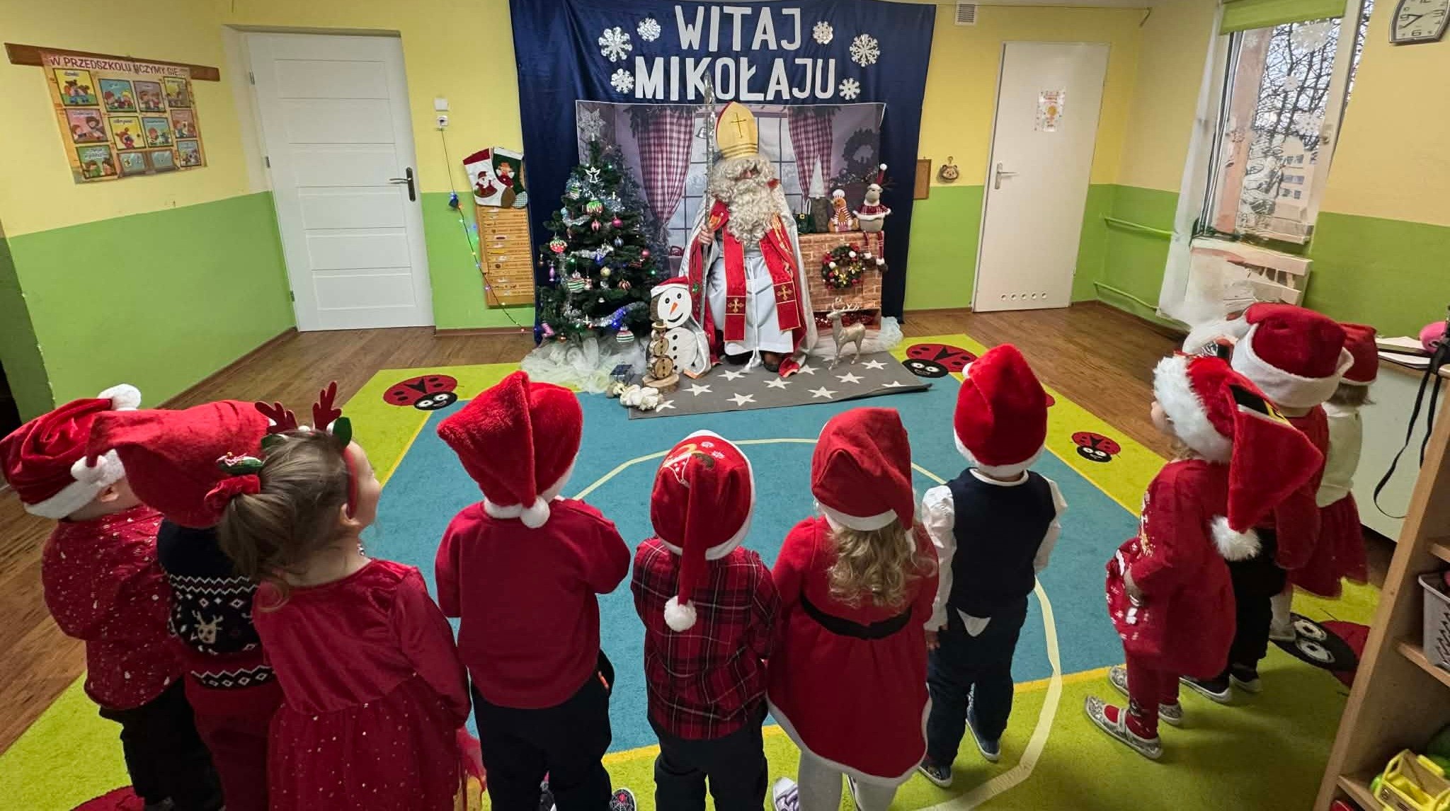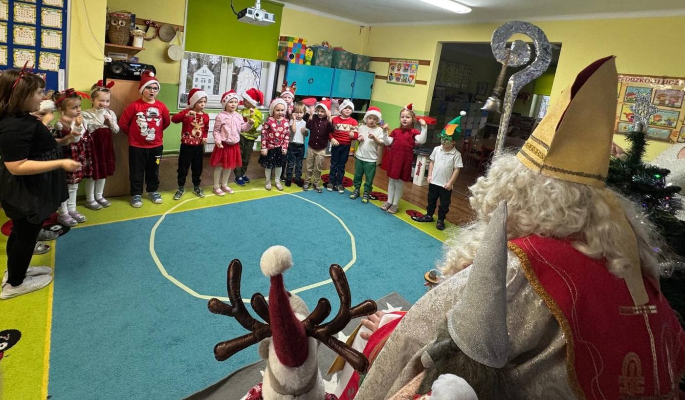 Dziś w naszym przedszkolu wydarzyło się coś niezwykłego — odwiedził nas długo wyczekiwany gość, na którego dzieci czekały z ogromnym zapałem i ekscytacją. Święty Mikołaj pojawił się w naszej sali z uśmiechem, dźwiękiem dzwoneczków i magiczną aurą, która od razu wprowadziła wszystkich w świąteczny nastrój.