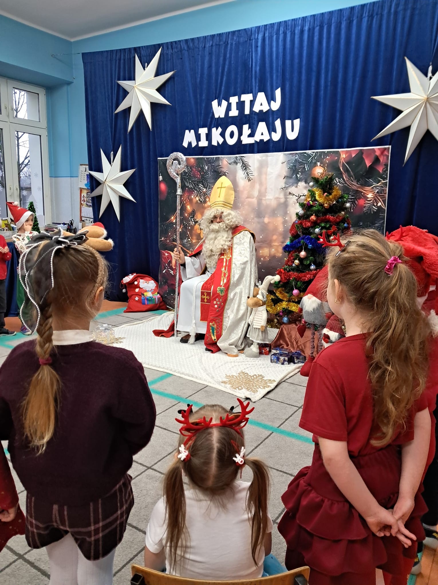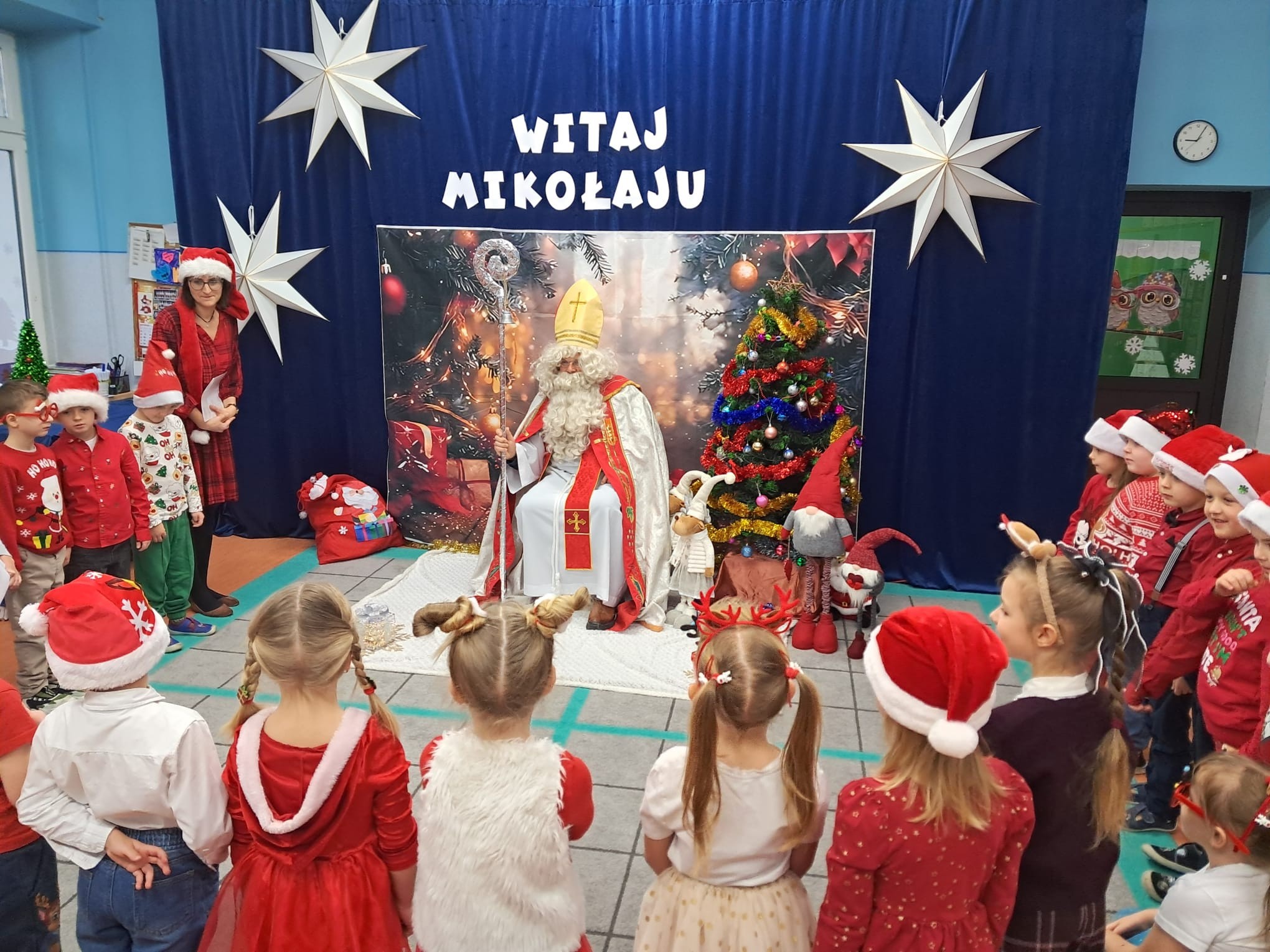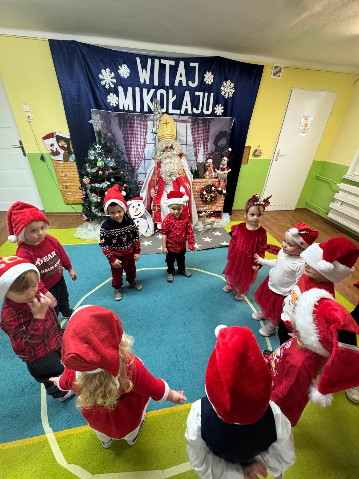 Dziś w naszym przedszkolu wydarzyło się coś niezwykłego — odwiedził nas długo wyczekiwany gość, na którego dzieci czekały z ogromnym zapałem i ekscytacją. Święty Mikołaj pojawił się w naszej sali z uśmiechem, dźwiękiem dzwoneczków i magiczną aurą, która od razu wprowadziła wszystkich w świąteczny nastrój.
