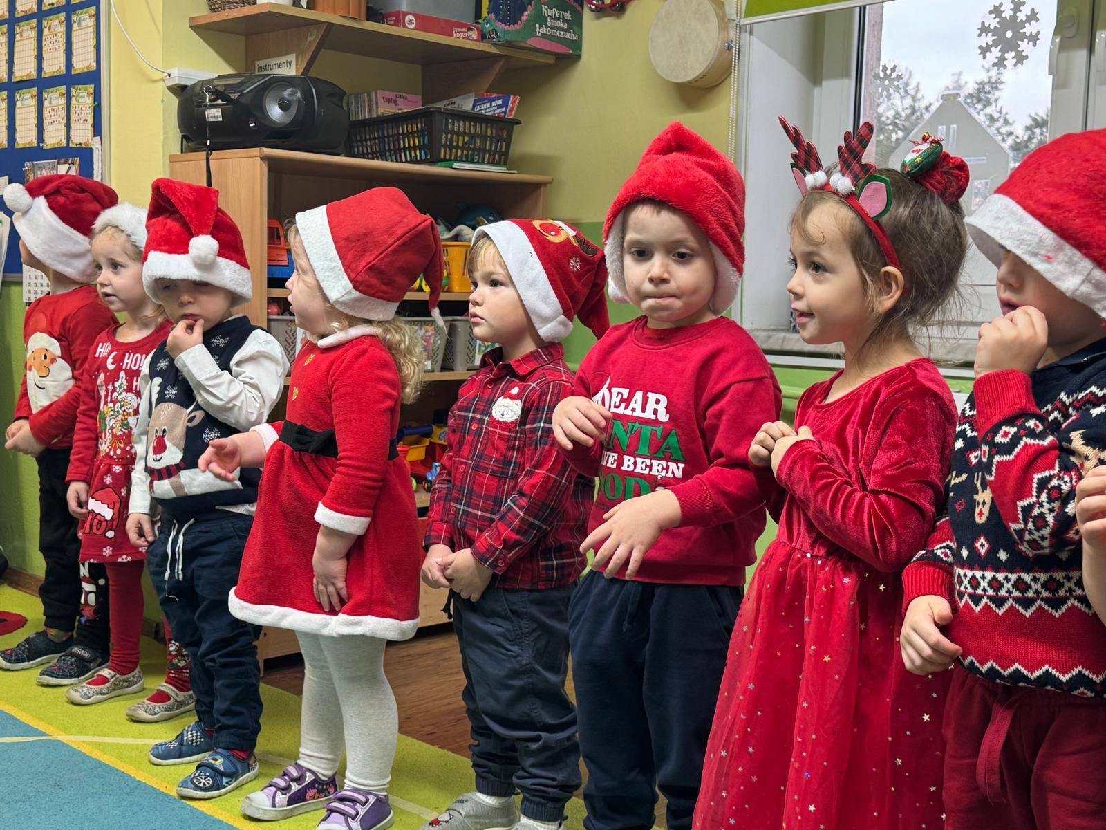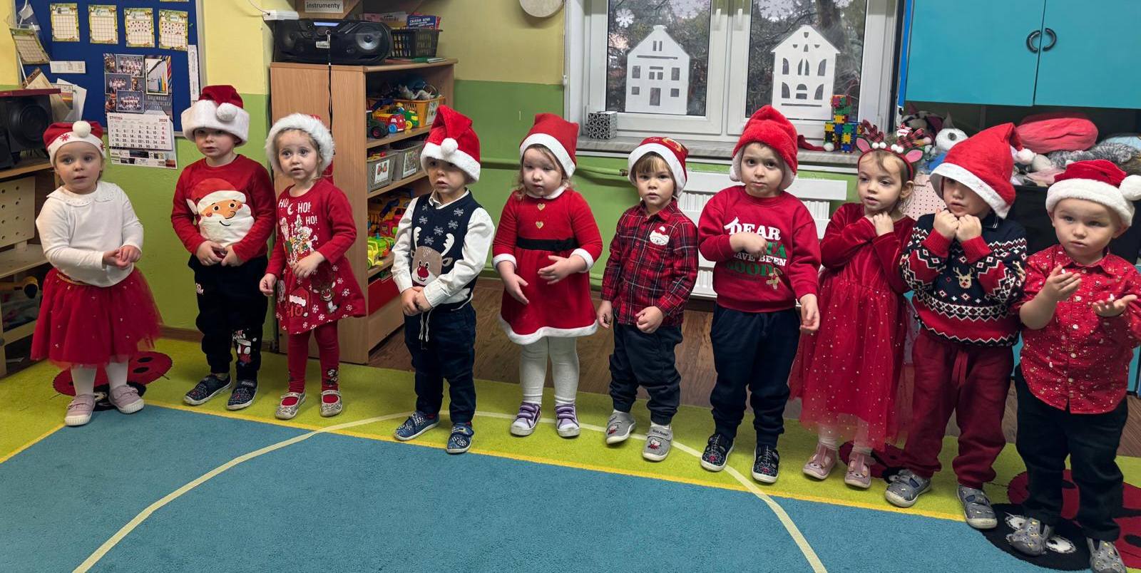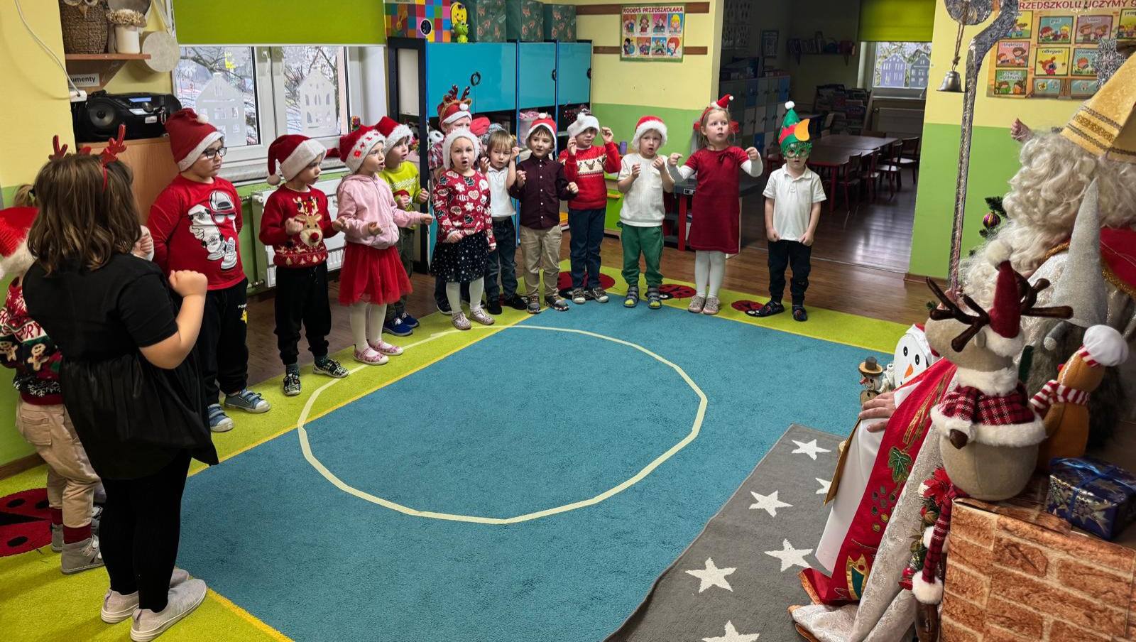 Przedszkolaki powitały Mikołaja wspaniałym programem artystycznym, który przygotowywały z wielkim zaangażowaniem. Były piosenki, wierszyki, życzenia oraz serdeczne uśmiechy — wszystko to sprawiło, że Mikołaj słuchał i oglądał występ z prawdziwym wzruszeniem.