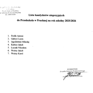 Szanowni Państwo, Drodzy Rodzice, uprzejmie informujemy, że zgodnie z wynikami postępowania rekrutacyjnego do publicznych przedszkoli na rok szkolny 2025/2026, przeprowadzonego w terminie od 10 do 17 lutego 2025 r., a także postępowania uzupełniającego, które odbyło się w dniach od 22 do 30 kwietnia 2025 r., na podstawie zarządzeń nr 242.2025 z dnia 28 stycznia 2025 r. oraz nr 309.2025 z dnia 17 kwietnia 2025 r., w Zespole Szkolno–Przedszkolnym w Pruchnej zostaną uruchomione trzy oddziały przedszkolne.