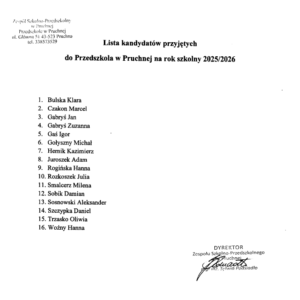 Miło nam poinformować, że w roku szkolnym 2025/2026 do przedszkola zostaną przyjęte wszystkie dzieci, które ukończyły 2,5 roku życia najpóźniej do dnia 1 września 2025 r. Szczegółowe informacje dotyczące wyników rekrutacji, w tym lista dzieci przyjętych, dostępne są na tablicy ogłoszeń w budynku Przedszkola oraz na stronie internetowej szkoły. Dziękujemy za zaufanie oraz zainteresowanie ofertą naszej placówki. Cieszymy się, że będziemy mogli wspólnie z Państwem towarzyszyć dzieciom w ich codziennym rozwoju, edukacji i radosnej zabawie.