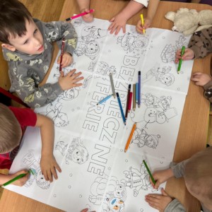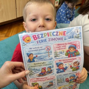 Rozmawialiśmy z przedszkolakami o tym, jak dbać o siebie nie tylko w przedszkolu, ale również poza nim – podczas spacerów, zabaw na śniegu, wyjazdów w góry czy odpoczynku w domu. Dzieci dowiedziały się, dlaczego nie wolno wchodzić na zamarznięte zbiorniki wodne, jak bezpiecznie korzystać z sanek oraz jak ważne jest noszenie ciepłej odzieży i elementów odblaskowych.