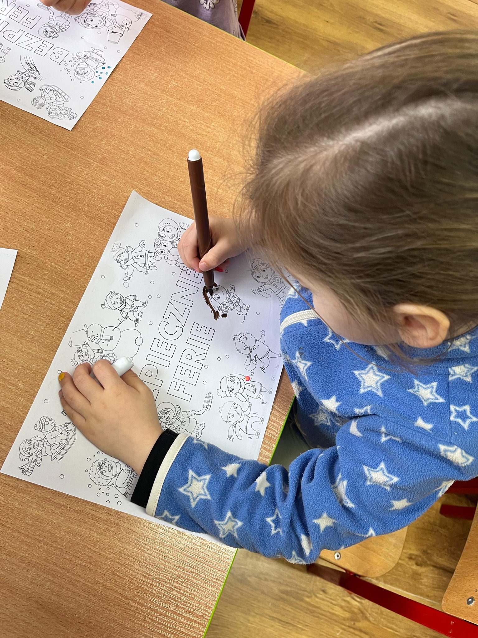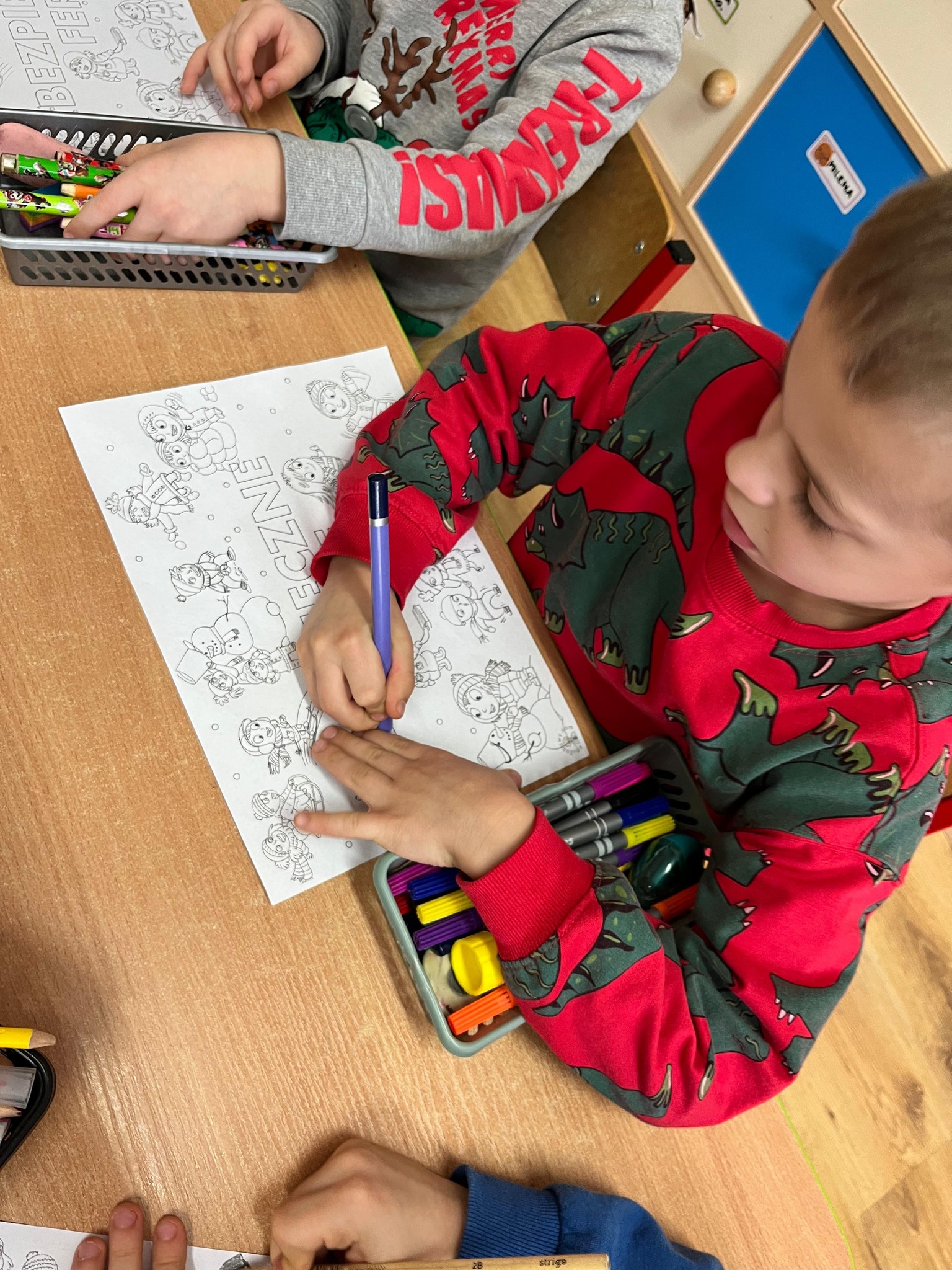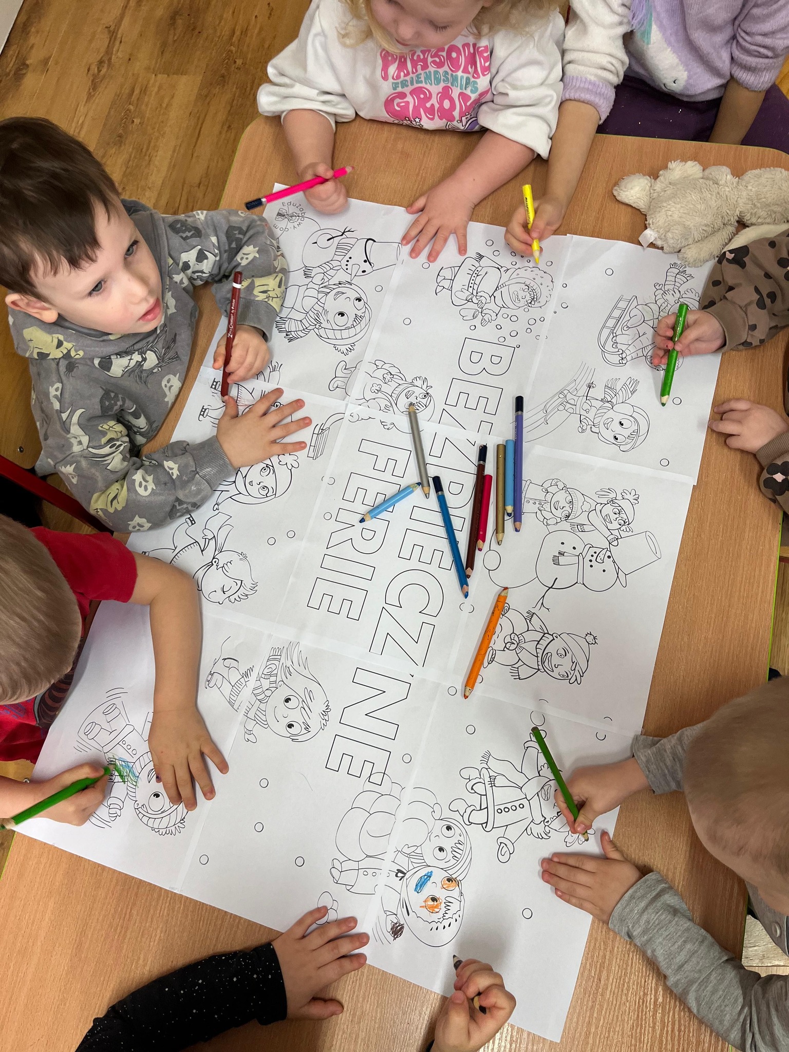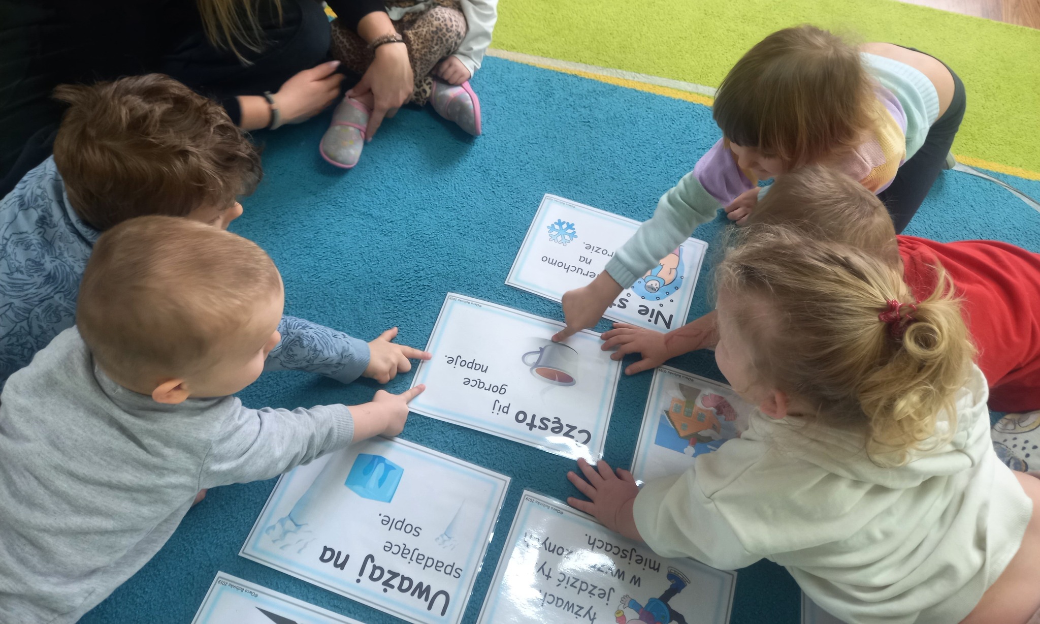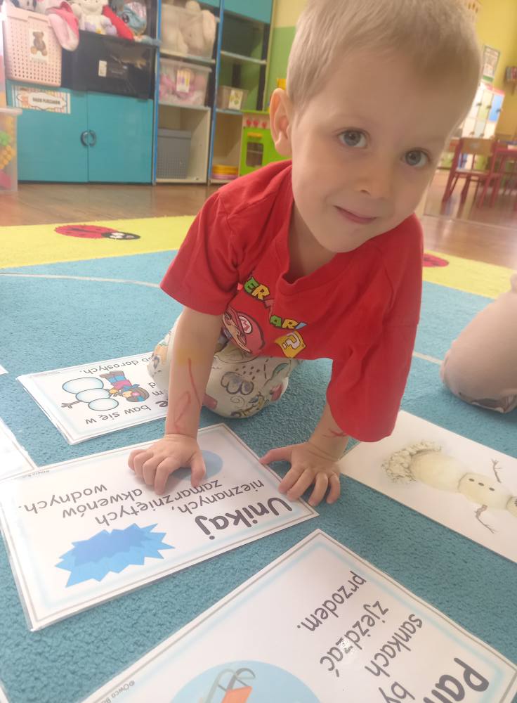 Rozmawialiśmy z przedszkolakami o tym, jak dbać o siebie nie tylko w przedszkolu, ale również poza nim – podczas spacerów, zabaw na śniegu, wyjazdów w góry czy odpoczynku w domu. Dzieci dowiedziały się, dlaczego nie wolno wchodzić na zamarznięte zbiorniki wodne, jak bezpiecznie korzystać z sanek oraz jak ważne jest noszenie ciepłej odzieży i elementów odblaskowych.
